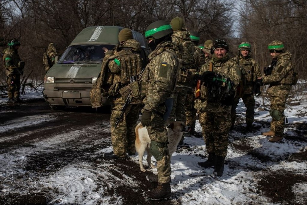 Fuerzas de Defensa Territorial en una carretera a las afueras de Bajmut (obsérvense los distintivos verdes) (Foto: The Korea Times. Edición digital,10 de marzo de 2023)