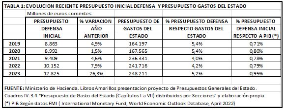 Los créditos presupuestados inicialmente para la sección 14, Ministerio de Defensa, alcanzarán los 12.825 millones de euros, lo que supone un incremento del 26,3 %, respecto al presupuesto inicial del año anterior y representa un 5,2% del presupuesto de Gastos del Estado para 2023, y un 0,95% respecto al PIB (ver Tabla 1).