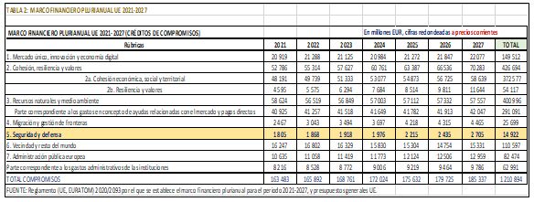 La Tabla 2 muestra el actual MFP 2021-2027, y que, a diferencia del anterior MFP 2014-2020, y a otros MFP de la UE que les han precedido, recoge una nueva distribución de rúbricas, consignándose por primera vez, y de forma específica, una para Seguridad y Defensa, viéndose los techos máximos para cada anualidad, y un techo máximo total de 14.922 millones de euros para todo el periodo considerado.