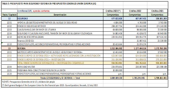 El presupuesto de la UE, a diferencia del MFP, es una previsión de ingresos y gastos, que se elabora, aprueba y ejecuta anualmente las anualidades correspondientes a Seguridad y Defensa, teniendo como referencia los techos máximos establecidos en el referido nuevo MFP 2021-2027. La Tabla 3, muestra las consignaciones presupuestarias de la UE ya aprobadas para los años 2021, 2022, y la prevista para 2023, relativas a Seguridad y Defensa, desglosadas en sus Títulos y Capítulos, según el sistema presupuestario de la UE. Así mismo refleja que las cuantías presupuestadas de cada año para el Fondeo Europeo de Defensa, las cuales son, respectivamente 930,3 millones en 2021; 936,7 millones en 2022; y 934,9 millones para 2023.