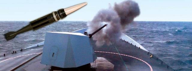 Fotografía: El proyectil DART (arriba a la derecha) de Leonardo, en el resto de la imagen un montaje rápido de 76 mm, de la misma empresa, que lo dispara. (foto Leonardo)