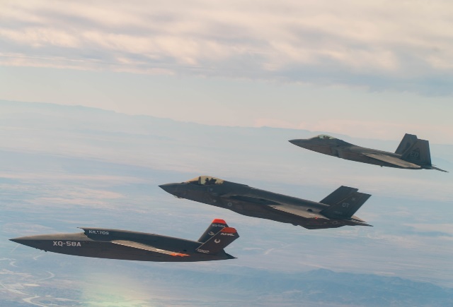 El XQ-58A Valkyrie junto al F-35 y F-22 (USAF)