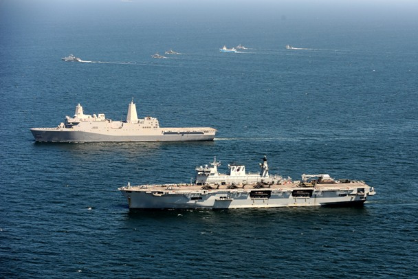 Foto: En primer término se puede ver el navío anfibio de la “Royal Navy” HMS “Ocean”, justo detrás el USS “San Antonio”, y más al fondo buena parte de los navíos participantes en BALTOPS 2015.