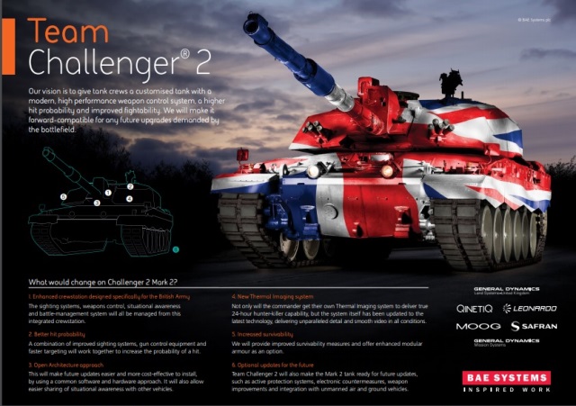 Además BAE Systems se ha aliado con General Dynamics Land Systems UK, General Dynamics MIssion Systems-International, Leonardo-Finmeccanica (anteriormente Selex ES), Moog, Qinetiq y Safran Electronics. Precisamente la participación de General Dynamics es otro factor importante ya que están construyendo el nuevo vehículo blindado Ajax (antes Scout SV) cuyas tecnologías podrían incorporarse al Challenger e incluso compartir instalaciones en Merthyr Tydfil, al sur de Gales.(José Mª Navarro García)