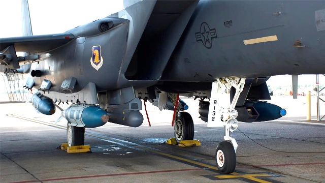 Un bombardero F-15E puede llevar varias JDAM modificadas para ataque naval y convertirse en un instrumento letal y económico. (AFRL)