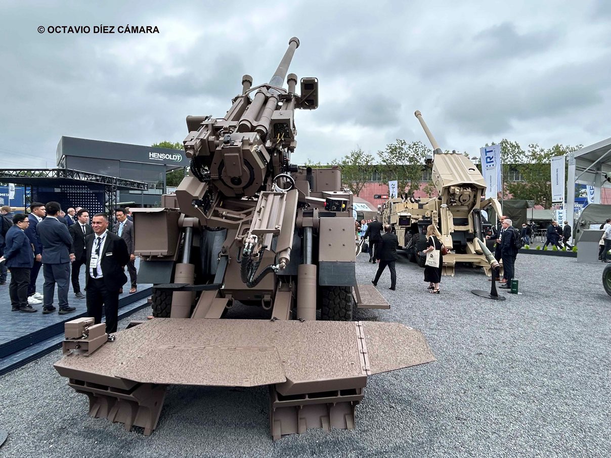 La compañía KNDS mostró el nuevo CAESAR 6x6 Mk2 junto a la versión 8x8 que cuenta con sistema de carga totalmente automático. (Octavio Díez Cámara)