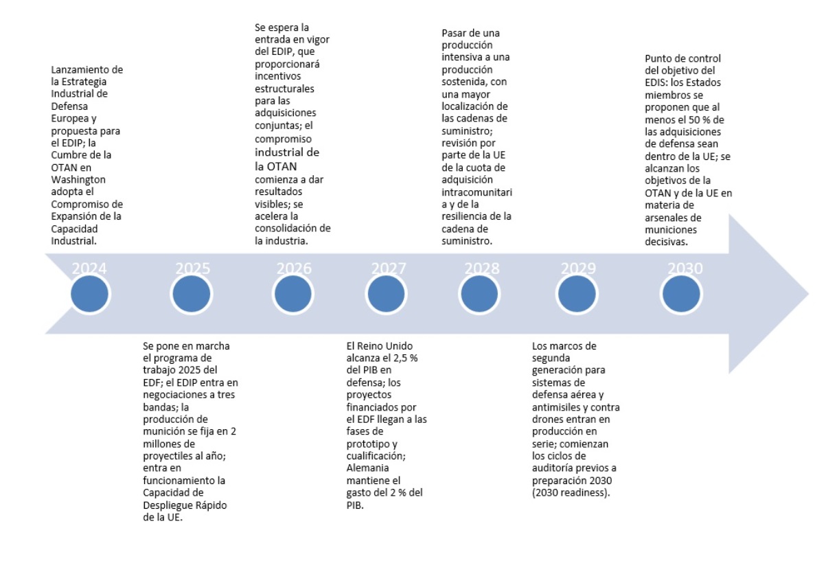 De 2028 a 2030, la atención se centrará en aumentar la producción en ámbitos de alta prioridad, como la defensa aérea terrestre, las municiones de precisión y los sistemas contra drones. Para el año 2030, la UE se ha fijado como objetivo que al menos el 50 %[4] de la adquisición se realice dentro de Europa, garantizando que la capacidad industrial y la resiliencia del suministro se incorporen como características permanentes de la seguridad europea.