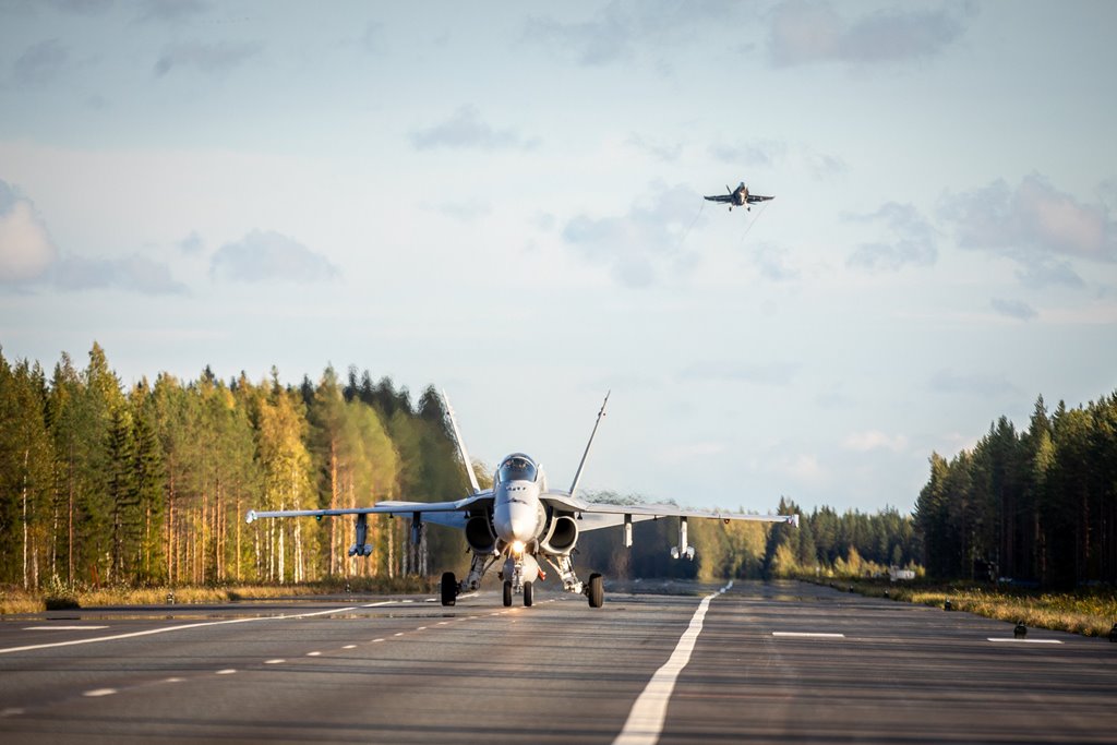 También, los F/A-18 finlandeses (en la imagen) y los Eurofighter de la RAF también operaron desde la autopista finesa. (foto Fuerza Aérea de Finlandia).