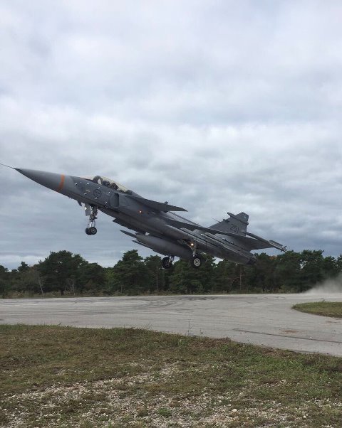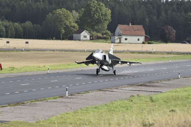 En una de las imágenes podemos ver despegando a uno de los JAS-39 de pruebas, como demuestran las marcas blancas/negras pintadas en la parte delantera del fuselaje, portando dos misiles Meteor y cuatro de los de corte alcance Iris-T. Pero los estrategas de la Svenska Flygvapnet saben que no se puede confiar todo a tecnología y han están volviendo a las técnicas de la Guerra Fría de en caso de ser necesario dispersar sus aparatos de combate en zonas próximas a aeródromos civiles y tramos rectos de carreteras, que permitan los despegues y aterrizajes de la aeronaves.