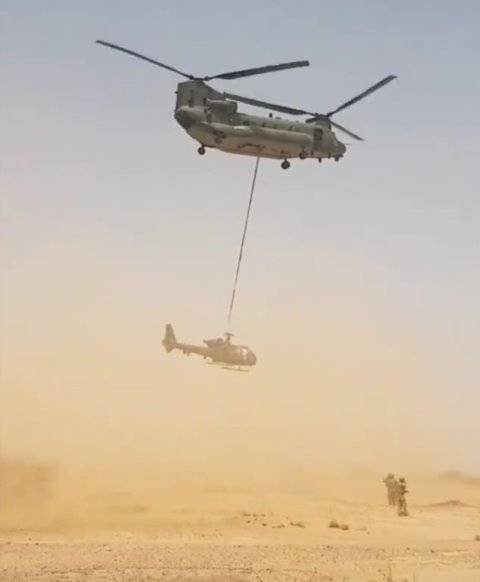 Tras sufrir una avería técnica, el aparato galo estaba posado en pleno desierto de Malí, una zona de alto riesgo donde operan columnas de diferentes bandas de terroristas islámicos. Tras asegurar la zona, y desmontar las palas del Gazelle, los técnicos de carga de la RAF han trincado a la pequeña aeronave, amarrándola a uno de los ganchos baricéntricos del Chinook mediante una eslinga, trasladándolo a una base en el Sahel, donde será reparado o repatriado a Francia, dependiendo de sus daños. Una misión que recuerda la efectuada en unas condiciones mucho más difíciles por un Chinook de la Aviación de Ejército de Tierra (ET) español en Afganistán en 2012, como ya informó defensa.com.