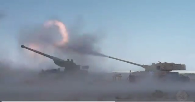 El M109 abre fuego. A su lado también participa lo que parece ser un M110 que también abre fuego (captura vídeo US DoD)