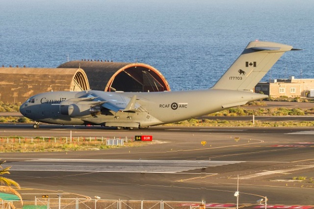 Una vez más la Base de Gando se convertía en el “portaaviones” de la OTAN y otras naciones occidentales para sostener las operaciones en el Sahel, donde en Malí y países vecinos se está luchan contra múltiples grupos de terroristas islámicos. En la imagen vemos el C-17A de la Royal Canadian Air Force (RCAF) que, tras cruzar el Atlántico procedente de su país, realizaba una escala en Gando desde donde reiniciaba viaje hasta Bamako, capital de Malí. Se trata de uno de los cinco CC-177 (designación militar canadiense del C-17) del 429 (T) Squadron, que tiene Base Aérea de Trenton, cerca de Ontario
