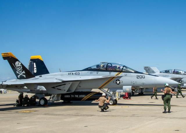 El Boeing F/A-18F “Súper Hornet” participante, por sus marcas en colores, lo que demuestra que es el del jefe del Escuadrón. (foto US Navy)