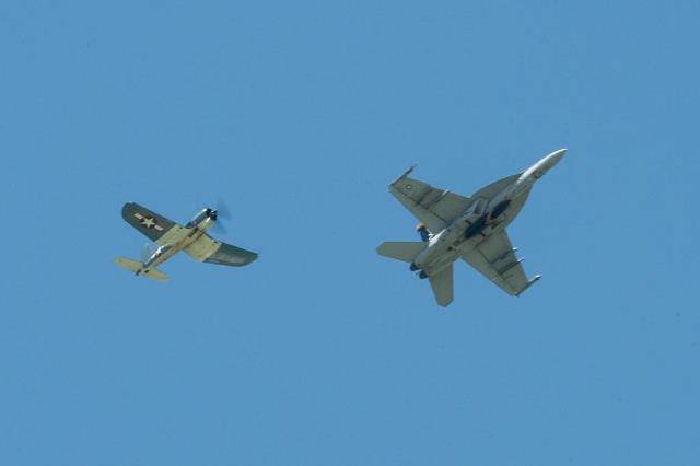 El presente de la aviación naval de la US Navy (Armada de los Estados Unidos) representado por un reactor Boeing F/A-18F Súper Hornet y su legado histórico, un avión de hélice y motor de explosión FG-1D Corsair, han volado juntos sobre Virginia.