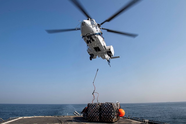 ·Momento en que un H225 desengancha la carga exterior, que acaba de dejar mediante un VR en la cubierta de vuelo de popa del USS “Normandy” (CG-60). (foto: US Navy).