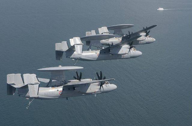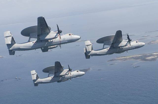 La imagen de tres E-2C Hawkeye de alerta temprana y control aéreo de la Marina de Francia volando en formación es muy infrecuente, ya que suman el 100% de esta flota, los ojos y los oídos de las operaciones aeronavales que se realizan desde el portaaviones francés Charles de Gaulle.