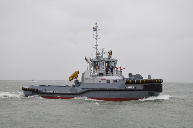 El primer de una serie de 3 ASD Tug 2810 Hybrid de la Marina holandesa se entregó en el puerto de Den Helder el 20 de febrero, tras su travesía dese el astillero de Damen en Galati (Rumanía). Bautizado como A871 Noordzee, su eslora es de casi 29 m. y es el primer remolcador híbrido suministrado la empresa de Países Bajos a su Armada. Actualmente esa Marina cuenta con ya con 4 remolcadores en Den Helder a su disposición, pero los otros viejos barcos no tienen suficiente potencia: HNLMS Karel Doorman, HNLMS Rotterdam y HNLMS Johan de Witt, que, además, utilizan hélices normales que restringen s maniobrabilidad y están fuera de la visión de sostenibilidad de la institución en el futuro. El Noordzee está provisto de dos unidades orientables de hélices para una maniobrabilidad óptima y es capaz de navegar con energía eléctrica por medio de un conjunto de baterías y también de forma diesel-eléctrica con el conjunto generador.