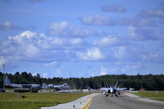 ·Un EF-18 español (de frente) en Ämari, a su derecha se ven A-10 y un C-130 de los Estados Unidos. Foto: USAF