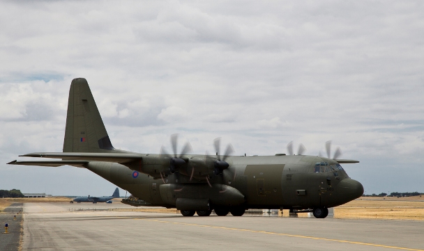 ·Un Lockheed Martin C-130J, o Hercules C5, de la RAF se dirige por una de las calles de rodadura a la plataforma de la Base Aérea de Beja (FAP)