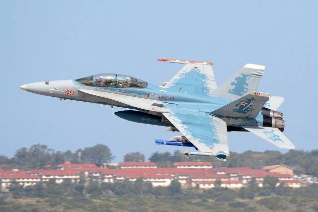 Fotografía: Un F/A-18B+ del VFC-12, su camuflaje es muy similar al del Su-57, y comparte la estrella roja en los estabilizadores.