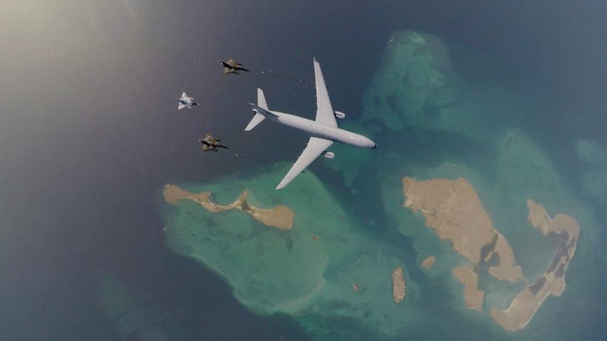 Los dos Mirage 2000D RMV, escoltados por un Mirage 2000-5F, en la fase final del viaje apoyados por un cisterna Airbus DS A330 MRTT “Phénix”. (foto Armée de l'Air et de l’Espace)