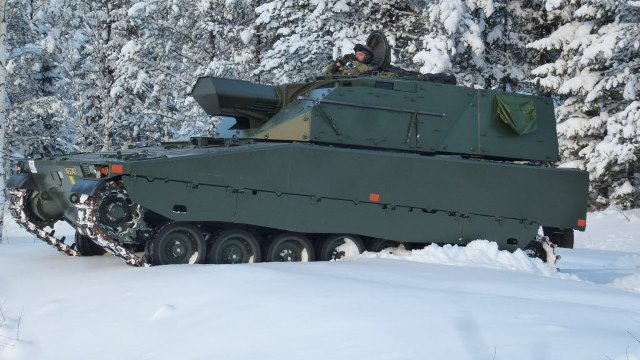 El impronunciable Granatkastarpansarbandvagn o Mjölner en posición de disparo (Ejército de Tierra sueco)