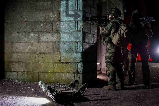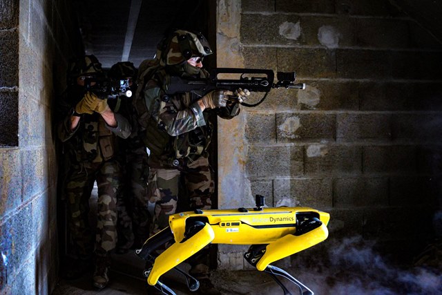 Hemos visto a militares franceses avanzar coordinados con robots Barakuda controlados a distancia portando en su frontal, como se observa en alguna imagen de las adjuntas, una amplia pantalla de protección antibala que les provee de la mejor cobertura para hacer frente a distintas amenazas balísticas. Asimismo, les hemos podido observar moviéndose por escenarios urbanizados acompañados de pequeños robots de ruedas y cadenas o de sistemas como un avanzado perro de Boston Dynamics que, con una movilidad óptima que le permite desplazarse sin problemas por zonas abruptas o subir y bajar por escaleras dentro de un complejo urbano, comprende varios sensores de observación que pueden ser especialmente útiles al entorno militar. (Octavio Díez Cámara)