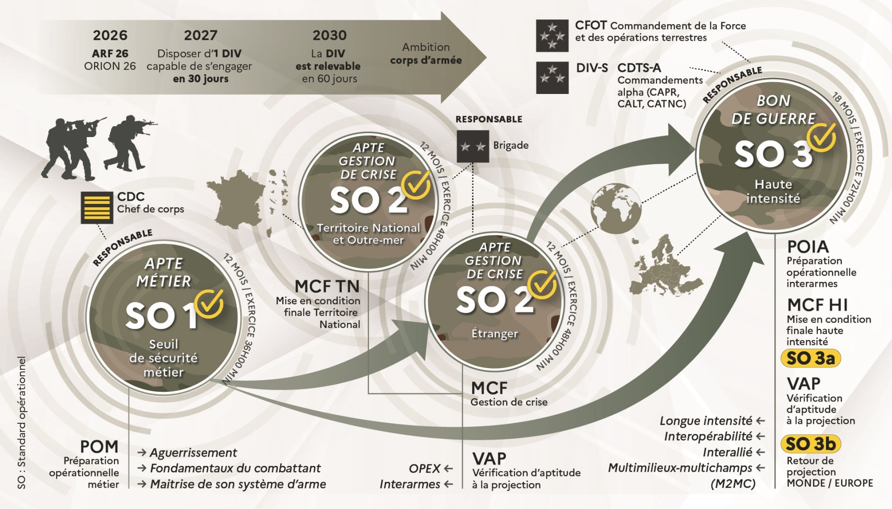 Francia apuesta, según se ha difundido a través de diversos canales públicos de l’Armée de terre, por estar preparada para hacer frente a todo tipo de conflictos. En esa búsqueda de tener mejor capacidad para el combate de choque se apuesta por programas de formación evolutiva en los que todos los componentes de una determinada unidad irán progresando para alcanzar el más elevado grado de excelencia y aquel potencial que les hagan óptimos para poder asumir sin problemas combates convencionales de alta intensidad.
