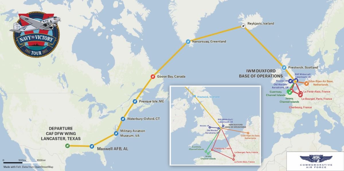 Mapa del trayecto del R4D denominado como “Navy to Victory Tour”. (foto Commemorative Air Force)