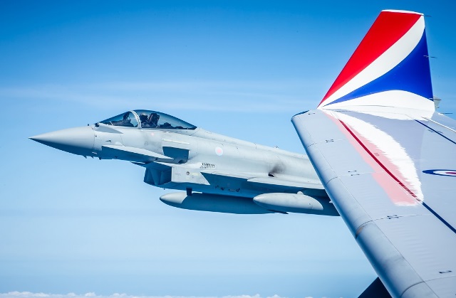 Imagen de uno de los Eurofighter “Typhoon” de la RAF, tomada desde el MRTT en la que se aprecia que sus winglets también están decorados con los colores de la bandera de Reino Unido.