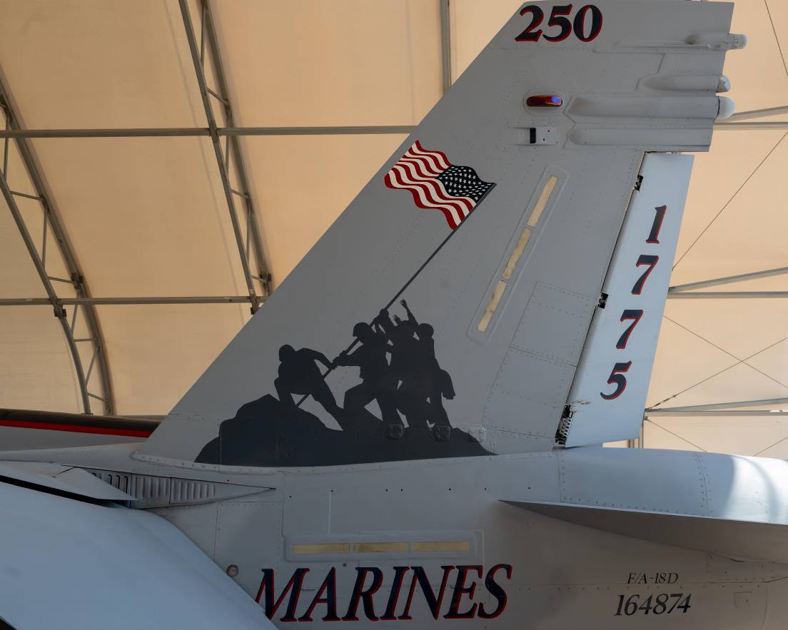 En las caras exteriores de los estabilizadores verticales, del avión conocido por el numeral “250” se observa una reproducción de la icónica imagen del izado de la bandera de Estados Unidos en la cima del Monte Suribachi, en la isla de Iwo Jima en 1945, tomada por el del fotógrafo Joe Rosenthal, y en las caras interiores aparece la insignia del USMC, que consta del águila, el globo terráqueo y ancla.