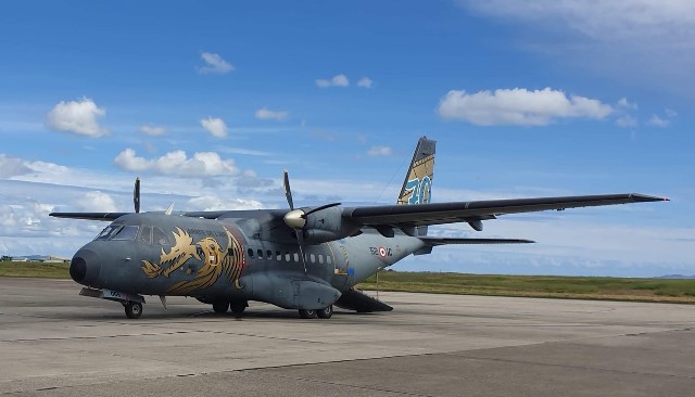 Fotografía: El espectacular CN235 pintado en recuerdo del EROM 80, desataca el dragón vietnamita en la parte delantera. (foto Armée de l´Air).