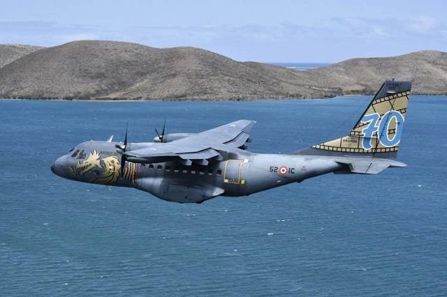 Este avión, el número 065 del Armée de l´Air, está destinado a la base aérea 186 “Paul Klein”, en Tontouta (Nueva Caledonia), donde sirve encuadrado en el Escadron de Transport 52. Aunque los colores especiales son frecuentes en los cazabombarderos, no lo son tanto en los transportes, y menos en los de este modelo español diseñado el pasado siglo por la empresa española Construcciones Aeronáuticas Sociedad Anónima CASA (hoy Airbus DS) en colaboración con la indonesia Industri Pesawat Terbang Nurtanio ITPN.