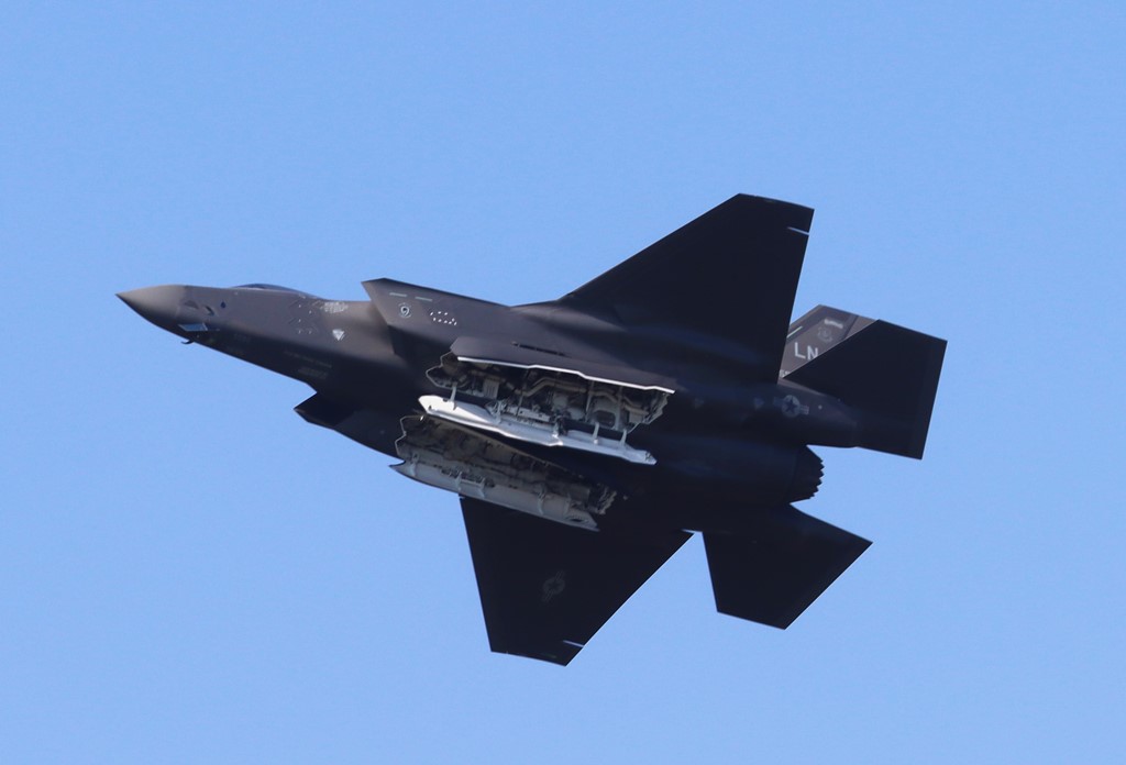 Las espectaculares imágenes del F-35 del equipo de demostración de la USAF, en este caso mostrando sus bodegas de armas abiertas. (foto Julio Maíz Gutiérrez)