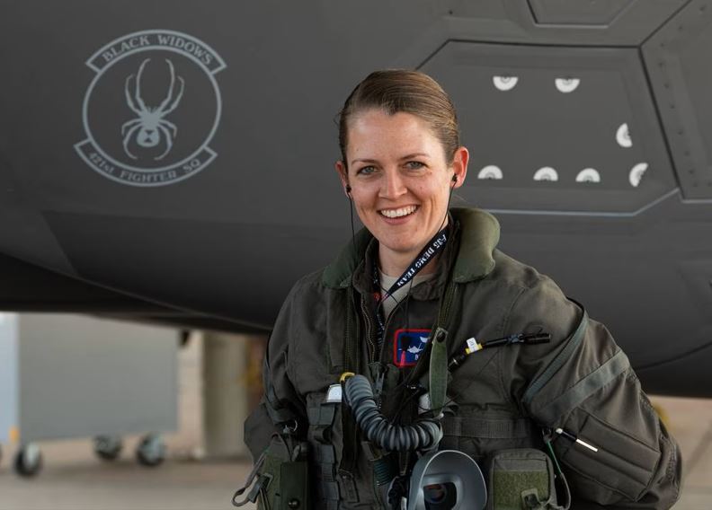 Imagen de la mayor Kristin "Beo" Wolfe, frente a un F-35A. (foto USAF)