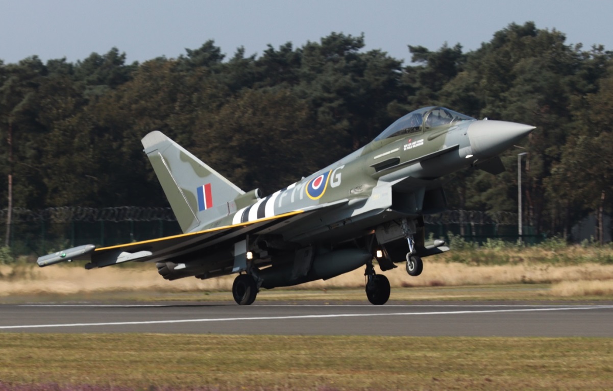 La Real Fuerza Aérea británica está exhibiendo en está temporada de festivales aéreos uno de sus aviones de combate Eurofighter Thypoon pintado con marcas y camuflaje histórico que evoca a los aviones de combate aliados, los Hawker Typhoon, que apoyaron la liberación de Europa Occidental durante la Segunda Guerra Mundial.