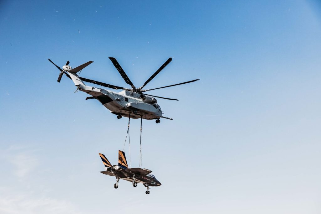 El F-35C se aleja portado a la eslinga por el CH-53K (US Marines)