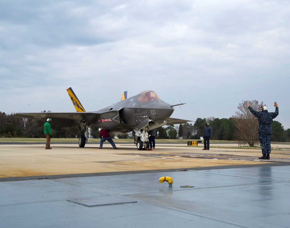 Se da la circunstancia que el avión empleado no era precisamente la variante de aterrizaje corto y despegue vertical (STVOL) sino un modelo de la variante embarcada de la Marina o F-35C, concretamente la aeronave CF-01 empleada para vuelos de pruebas por el Air Test and Evaluation Squadron (VX) 23, reconocible tanto por la decoración azul y amarilla de sus timones como por las marcas del fabricante Lockheed Martin en el fuselaje en el que aparecen banderas de los operadores.