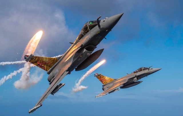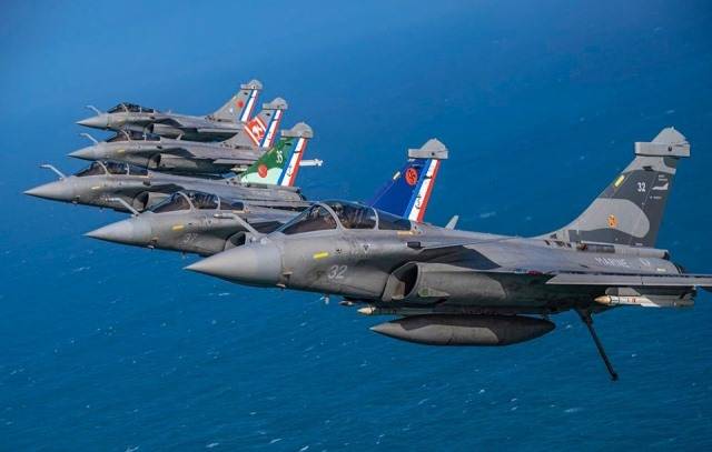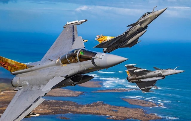 Fotografía: Formación de los “Rafale” con decoración especial. (foto: Aéronautique Navale-B.Otelli).