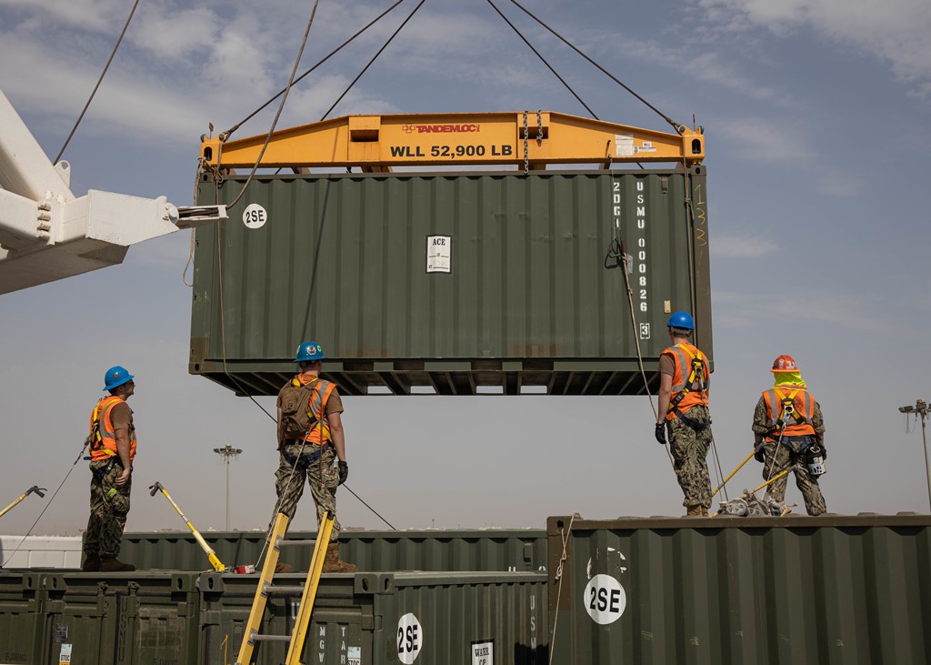 Contenedores con equipo militar son cargados en el buque USNS “Seay” en Arabia Saudí el año pasado (US Navy)