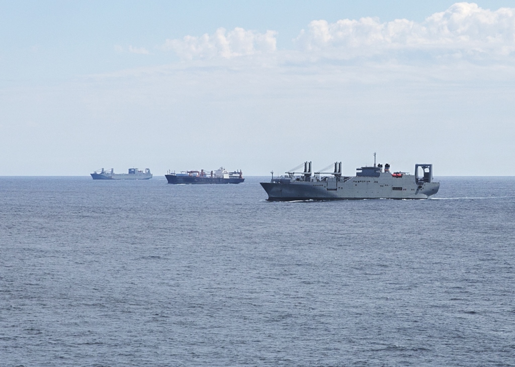 Tres buques militares de transporte asignados a la Military Sealift Command, transportan equipo militar por medio mundo como parte de la flota de preposicionamiento (US Navy)