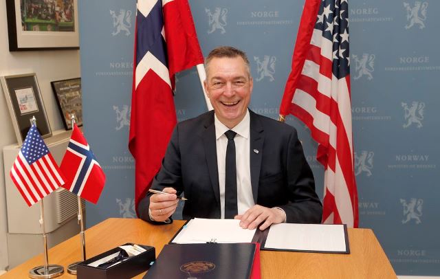 El ministro de Defensa noruego Frank Bakke-Jensen firma el acuerdo de cooperación con Estados Unidos (Fuerzas Armada de Noruega)