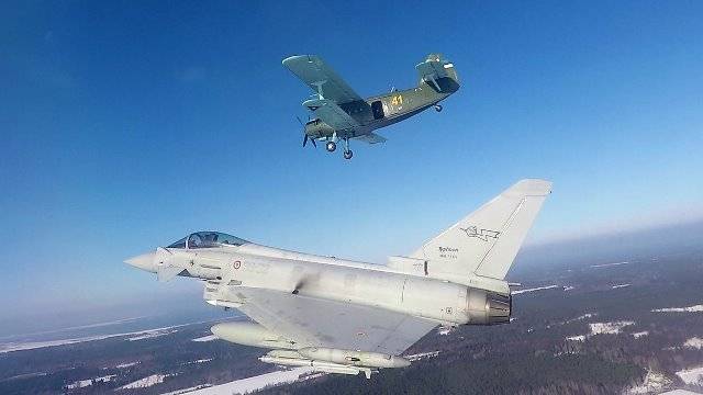 Desde Estonia nos llega la curiosa imagen de un moderno cazabombardero europeo Eurofighter interceptando a un biplano de los años cuarenta, en concreto un Antonov An-2 de fabricación soviética. La imagen captada por la Aeronautica Militare Italiana (AMI) está tomada en las cercanías de la Base Aérea de Ämari (Estonia) donde actualmente los transalpinos tienen desplegados cuatro cazabombarderos Eurofighter que aseguran la protección aérea del Báltico en el marco de la BAP (Baltic Air Policing), en la que también participa España.