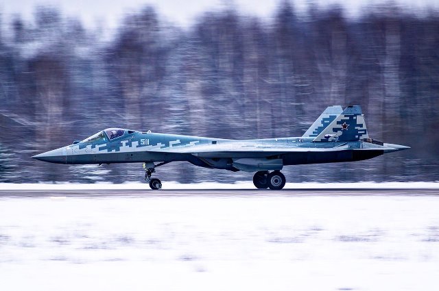 ·Imagen de un Su-57 ruso pintado con el camuflaje pixelado.