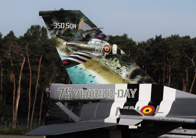 Entre las aeronaves concentradas en el festival aéreo en base belga de Kleine-Brogel y el cercano aeródromo de Sanicole el pasado fin de semana se encontraban varios F-16 cuya pintura recuerda a los cazas de la Segunda Guerra Mundial Supermarine Spitfire. Conmemorando los 75 años desde el Desembarco de Normandía y la posterior liberación de Francia y Bélgica varias fuerzas aéreas de la OTAN han aplicado a sus actuales aviones de combate las bandas de invasión (tres blancas y dos negras), que llevaban sus aviones, inclusive los Spitfire de fabricación británica, con los que participaron en dicha fase de la Segunda Guerra Mundial.