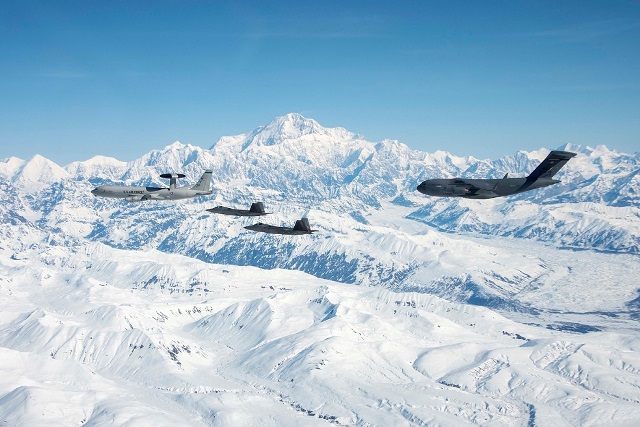 En otras de las imágenes se ve que a la formación se han incorporado un avión de alerta temprana o AEW&C (Airborne Early Warning and Control) Boeing E-3B del 962nd AACS (Airborne Air Control Squadron) “Eye of the Eagle” y un transporte Boeing C-17 Globemaster III del 144th AS (Airlift Squadron) de la Guardia Aérea Nacional de Alaska, ambos con base en Elmendorf-Richardson.