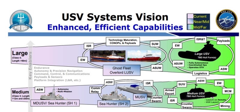 El denominado Large Unmanned Surface Vehicle (LUSV) o Vehículo no Tripulado Grande tendrá una eslora de más de 50 metros, completará su diseño conceptual durante este año, se revisará el diseño detallado y se elegirá posteriormente un proveedor. El Plan de Evolución de Capacidades de Superficie de la Navy contempla emplearlo como plataforma de fuego distribuido. Para el Medium Unmanned Surface Vehicle (MUSV) ya se está buscando proveedor después de haber revisado el diseño, estando previsto que se entregue en 2023. Tendrá una eslora de entre 12 y 50 metros y según los planes de la Marina, este buque será empleado para portar sensores y para actuar como relé de comunicaciones. (José Mª Navarro García)