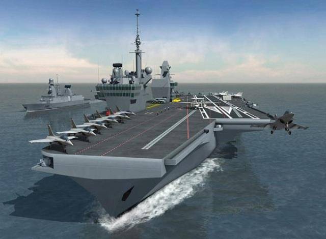 Fotografia: Imagen digital del futuro portaaviones de la Marina francesa, en la que se observa un “Rafale” despegando desde su cubierta en ángulo.