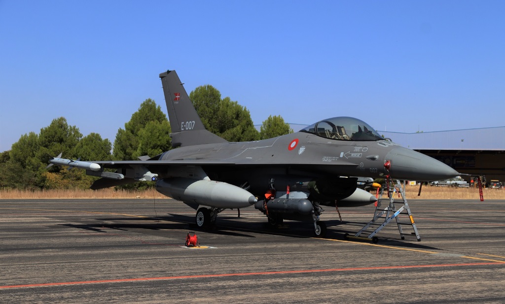 Este aparato de la Real Fuerza Aérea de Dinamarca o Flyvevåbnet es uno de los 8 que se han desplazado hasta España para participar en el curso Tactical Leadership Programme (TLP) de la OTAN, que se organiza y realiza unas 3 o 4 veces al año en la base del Ejército del Aire y del Espacio de Albacete.