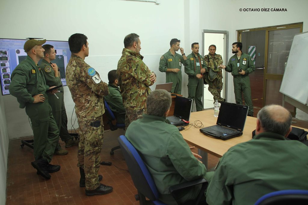 Pilotos y otro personal repasan la programación de uno de los ejercicios que se llevó a cabo para neutralizar un objetivo de alto valor estratégico. (Octavio Díez Cámara)